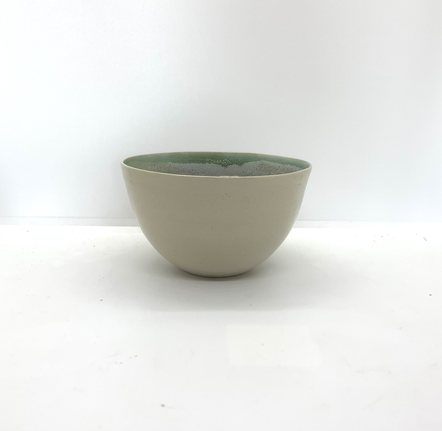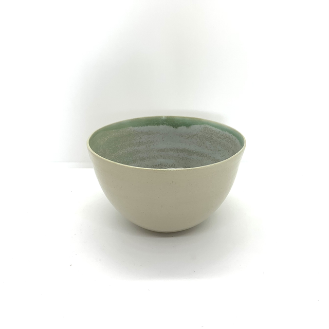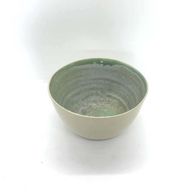 Petit bol créé au tour, vert et marron moucheté à l’intérieur et beige sur l’extérieur.
