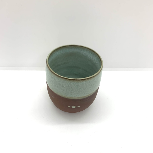 Tasse en grès créée au tour émaillée à l’intérieur + bordure en céladon.