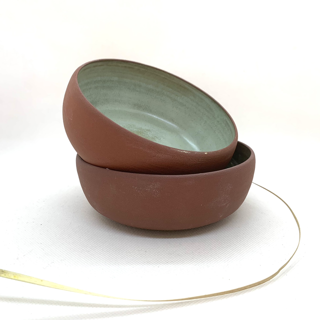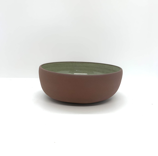 Bol ouvert crée au tour, émaillé en céladon à l’intérieur. Terre couleur lie de vin à l’extérieur.