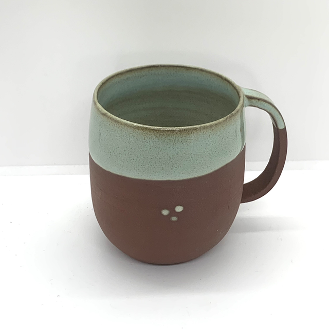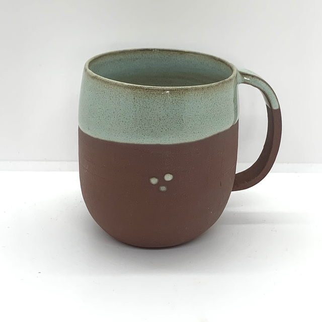 Tasse avec anse créée au tour, émaillée à l’intérieur + bordure en céladon.